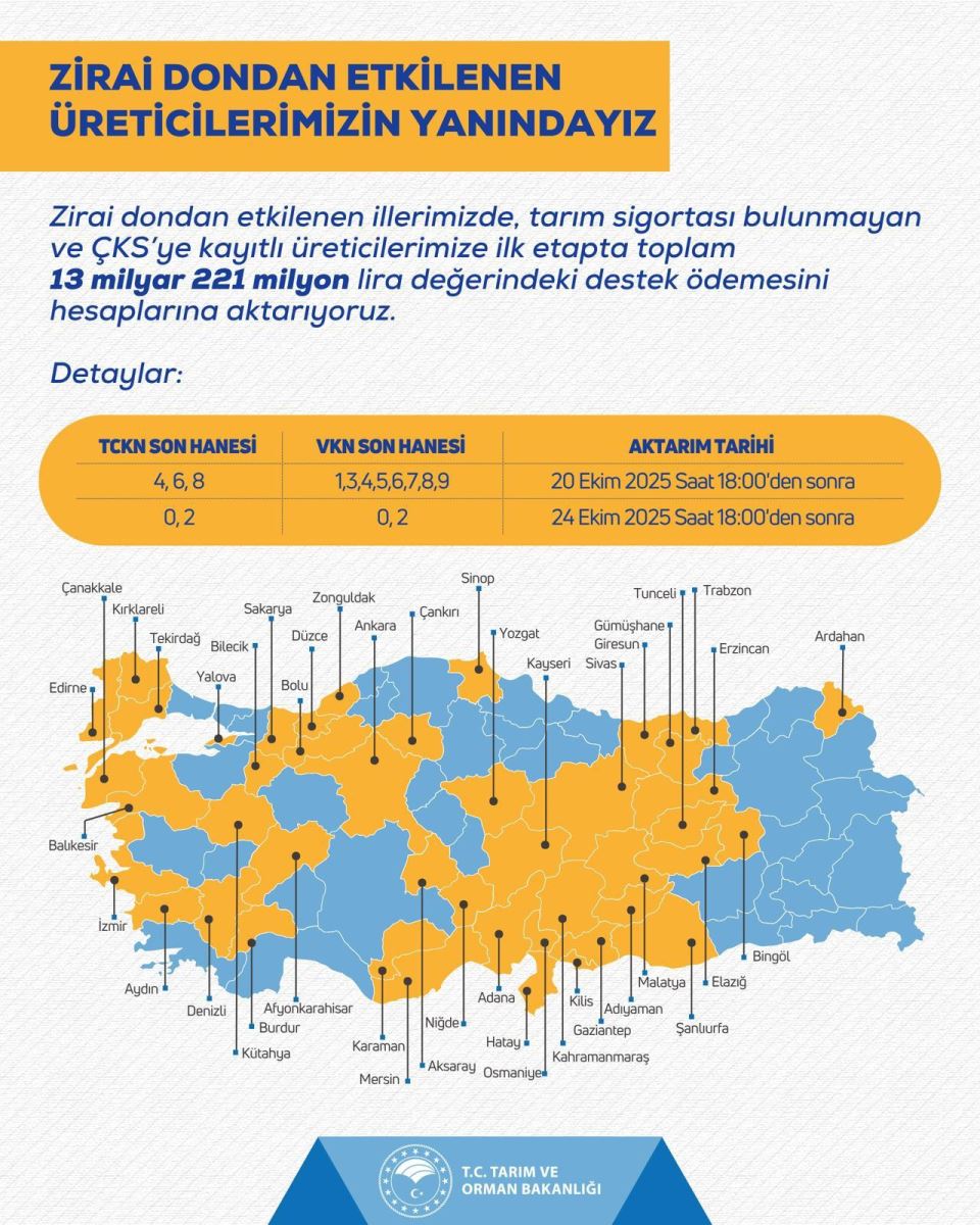 Dondan zarar gören çiftçilerimize belirlenen zarar oranları ve ekili ürünlerine göre destek ödemeleri TC no sırasına göre bu akşam 18:00’den itibaren yatırılmaya başlanmıştır.